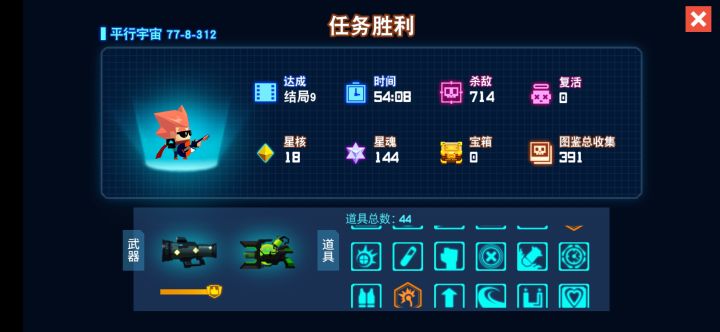 普通宇宙15分钟通关,并没有解锁什么东西平行完全可以三分钟以内,为了选的实验室的线慢一点,如果只追求速度的话可以不开箱子不进商店,不捡东西。闪电斧配两个加距离的,一个热成像,别的有没有就无所谓了,我没有摩羯那个加攻速的不然飞快,哈哈哈哈哈。大佬们二十分钟出头能打完,还是要多学习学习。这次已经是最快的一次了,进了很多商店,捡完了所有东西强迫症看到地上有东西不捡不舒服哈哈哈哈哈墙裂建议把闪电