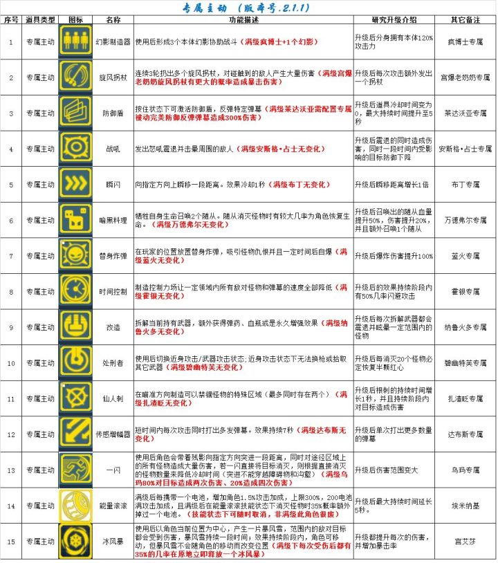 因怕一主题多楼层TAP抽疯导致,回复楼层会有看不见问题,所以采用多主题帖合一链接方式。PS:如果有错误,大家回复我看到会更改的,谢谢。一般情况下标题写明为版本号的,图中小标题中为老的不要介意,根据新增道具来更改的,若新增后会改标题,若没有表明至今未新增道具。全被动道具解锁条件及效果(含升级效果)说明。专属主动专属被动套装通用主动通用被动