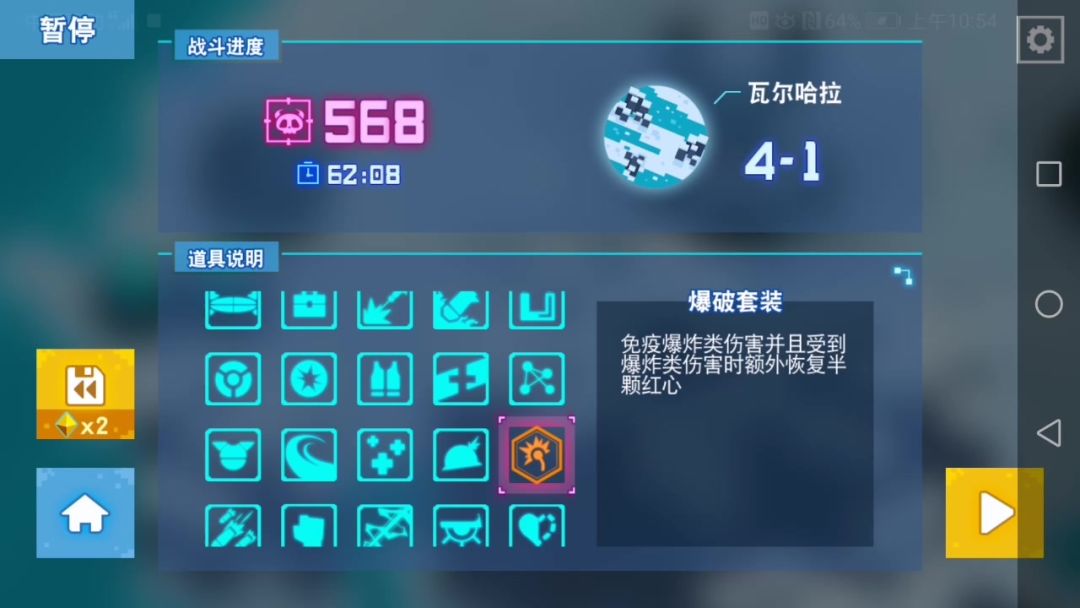 有人肯定以为我是用自我宝石加士力架,其实一开始我也是想这样的,可是结果呢,脸太黑,一直不出,只能勉为其难的用超活性分子和火力核心了,开局选个万德弗尔,因为这个人物有盾,可以抵消一次伤害(抵消一次也算无伤),提高容错率,然后就是找技能超活性分子、火力核心、反弹子弹,这三个是核心技能,武器选冰冻枪,因为要冰冻boss提高容错率。没错,在没有自我宝石的情况下疯狂提高容错率才是王道,因为被打一下整吧游戏都