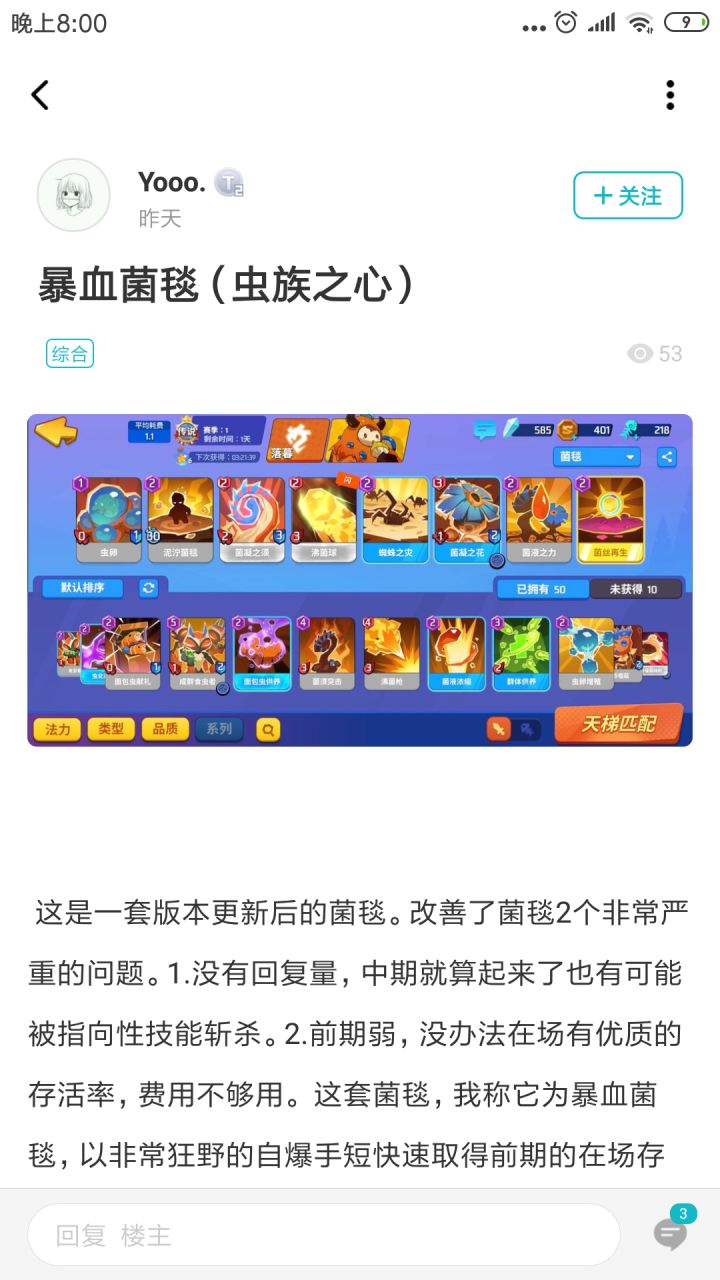 落幕的一些牌组1.排位都是幽夜,被虐哭了T﹏T。这套卡组是yoo改的,我试了下,如果运营的好,后期很恐怖老子直接就卡了。。。无限回血,不缺蓝,很棒。领主之前用起来会很爽,国王后得吃技术了,反正我没玩透,经常输,可以去看yoo的攻略。2.应该是正常的菌毯,我自己组的,不知道标不标准。用起来感觉灵活性比第一套好,也没那么极端,因为蜘蛛菌毯加强了,用起来很舒服。3.上个赛季用的卡组,菌林