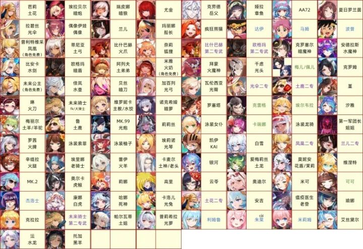 目前版本地精诺艾尔一句话总结:主33 44 萌新不考虑优先抽英雄选择篇属性克制关系:暗克虚 虚克光 光克暗 火克土 土克水 水克火首先就是萌新问的最多的自选问题,自选选谁呢?为什么大佬都不让抽其他池呢?究其原因就是为了让萌新开荒更舒服能拿到各个模式的低保。那我们的目的就非常简单了,没有资源养的话把多个模式都强角色抽出来养不就完了。自选(不定期更新)贝丝(别称暗刀,前女友,全模式通