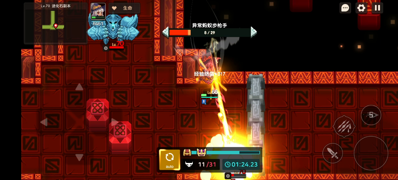 这单人70级最后一个进化石副本可太有意思了,自动战斗角色屏幕内没敌人就拼命向上跑,这能自动战斗过关就有鬼了。开局就杀四个怪,然后沿着通道直接向上跑路,三分钟过去了,就杀了12个怪。其他的怪物全在下面。他也不下去,就在上面挂机一样。
