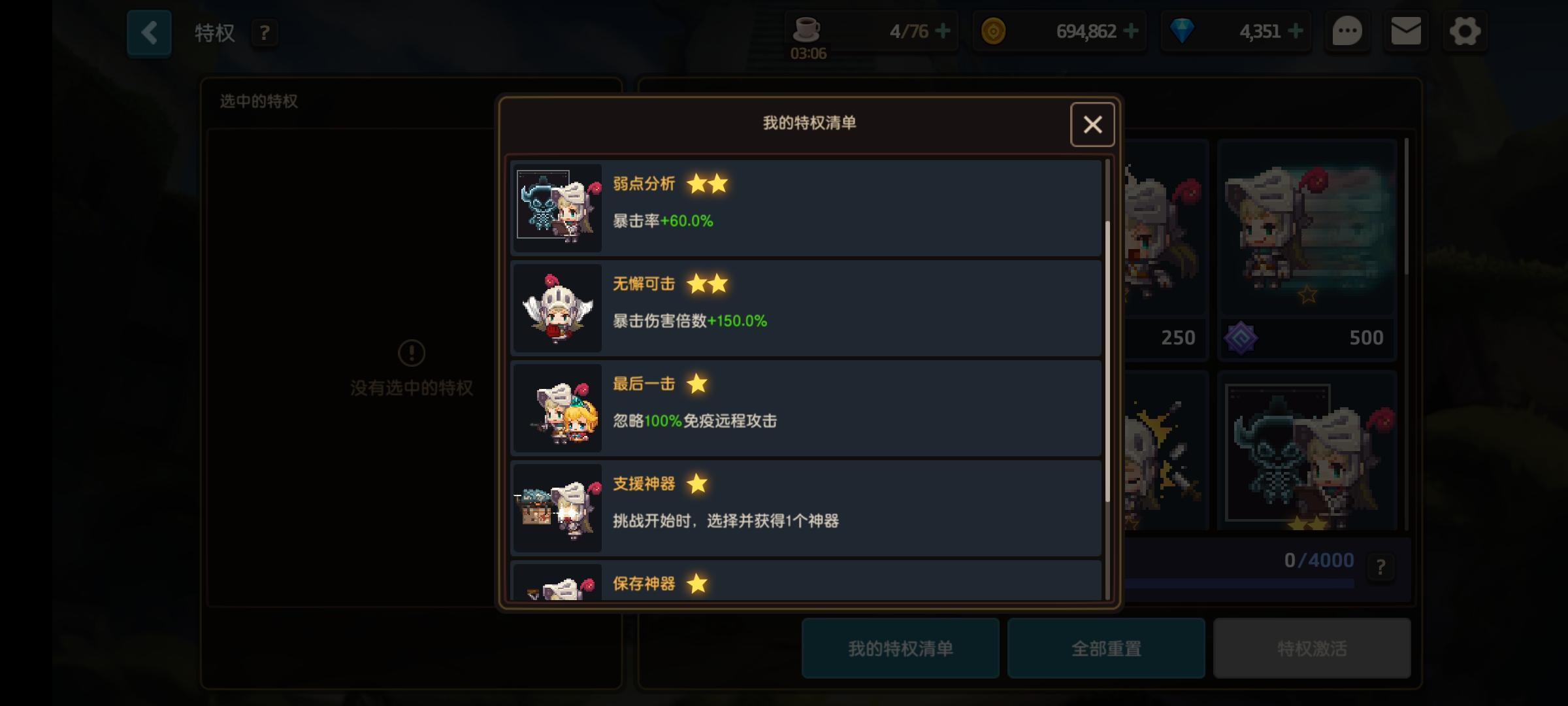 特权加一个免疫100%远程防御致命一击,点免疫近战100%防御穿盾攻击,性价比不高,因为现在国服远程英雄多(除非你用暗刀什么的近战队)。特权再加一个保存神器和一个神器支援神器,开场带两个精灵干粮直接才战斗格子(中间再遇见干粮不要拿了,两个干粮已经够用了)。