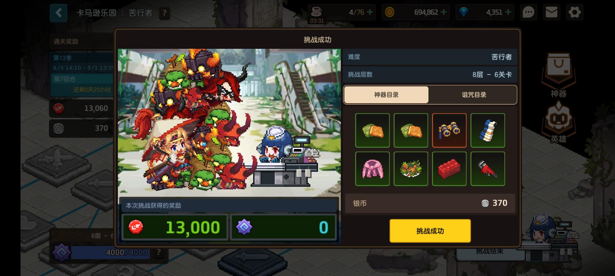 闯关是争取这期前两层拿到捕蝇草,拿到捕蝇草时就去才问号格子,用捕蝇草在老板娘那里换到捕蝇草沙拉,自带生命加成和击败敌人20%的生命加成,就不用带地精贩卖机了,腾出一个神器空位。如果在第一层拿到捕蝇草,这样有很大的几率在前三层换到沙拉,那开局就很漂亮了。难度5很轻松通关。轻轻松松搬空商店,还是换锤子。🙈🙈🙈(当然这个想法只能在第四回合积分在4000的时候才容易成型)
