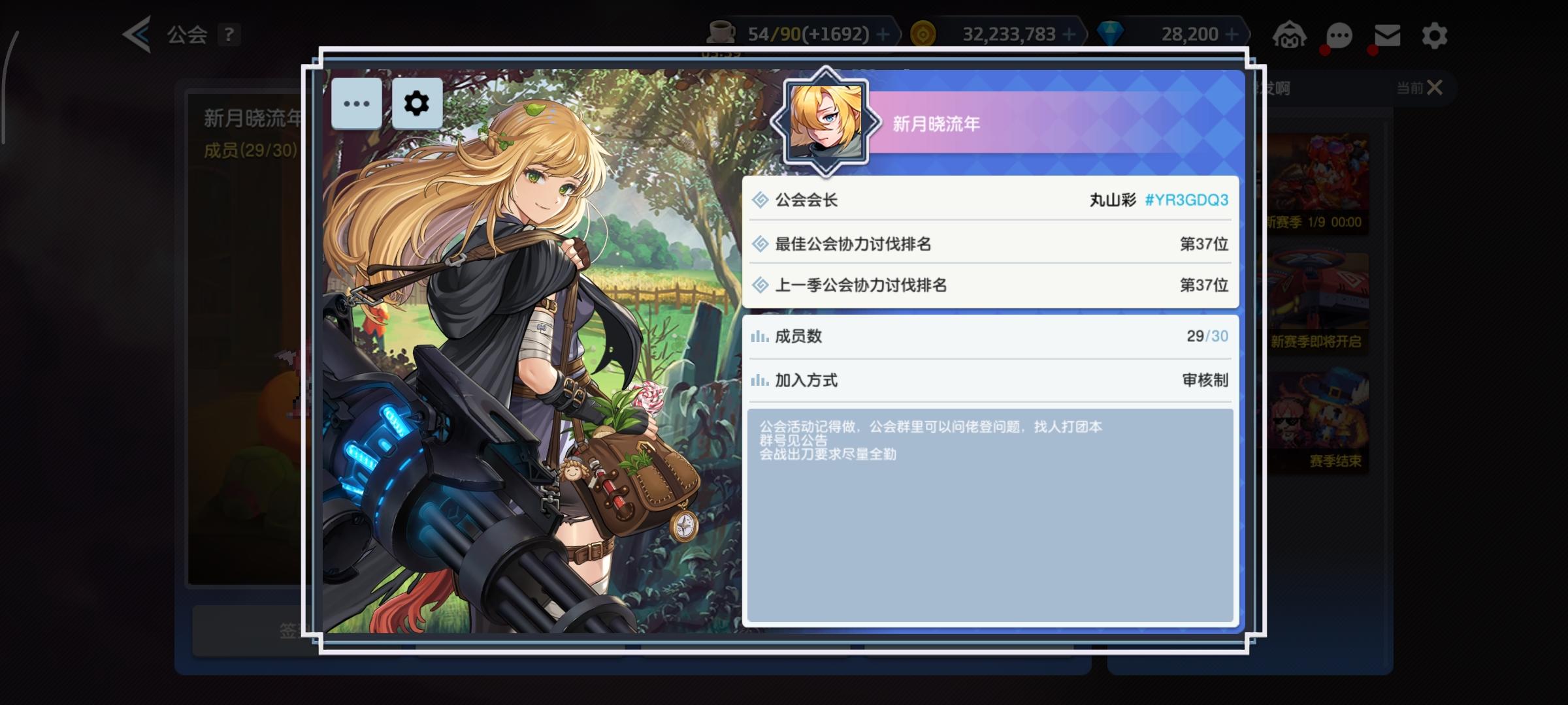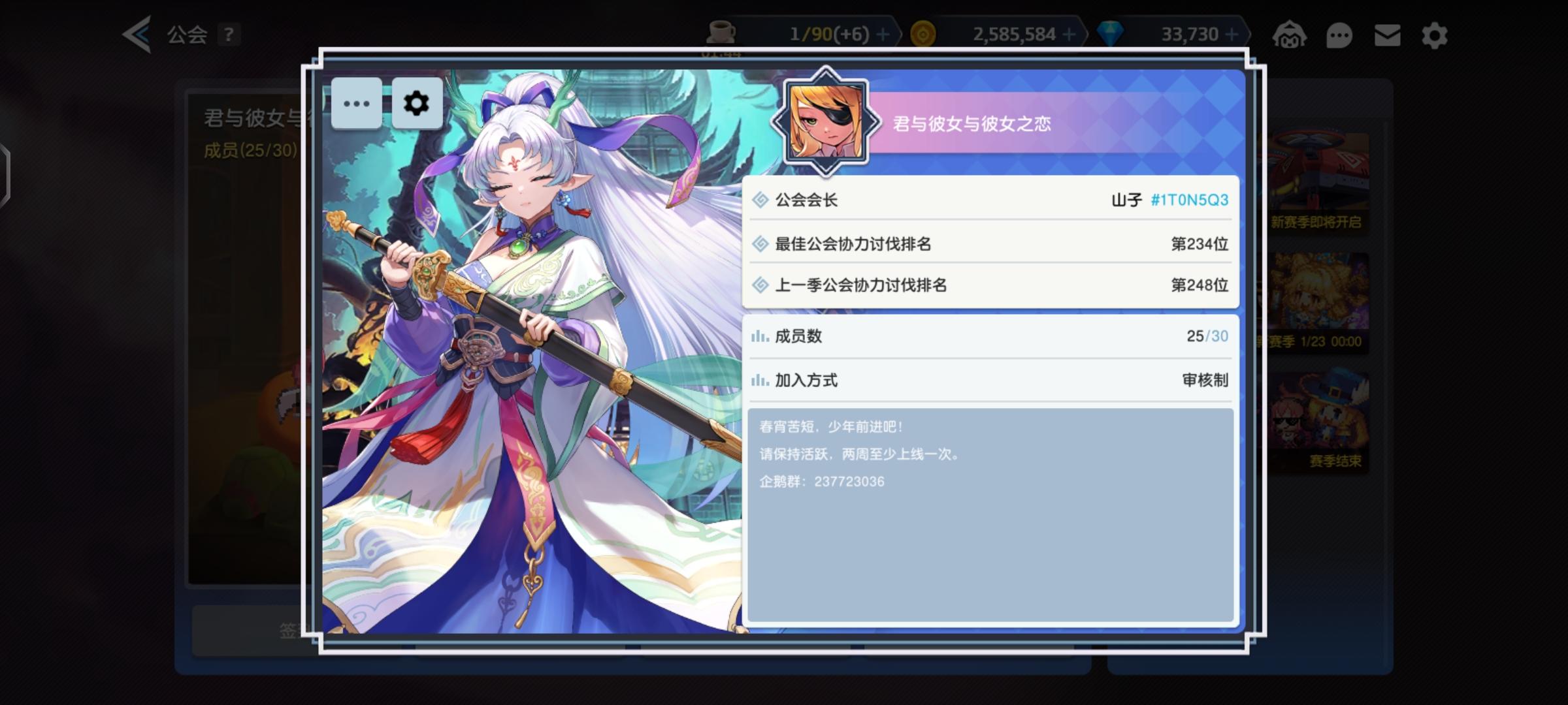 公会名“君与彼女与彼女之恋”,本期排名248,招5位活跃常玩的小伙伴,能出刀是最好的,不出也行,一周需要至少上线一次。