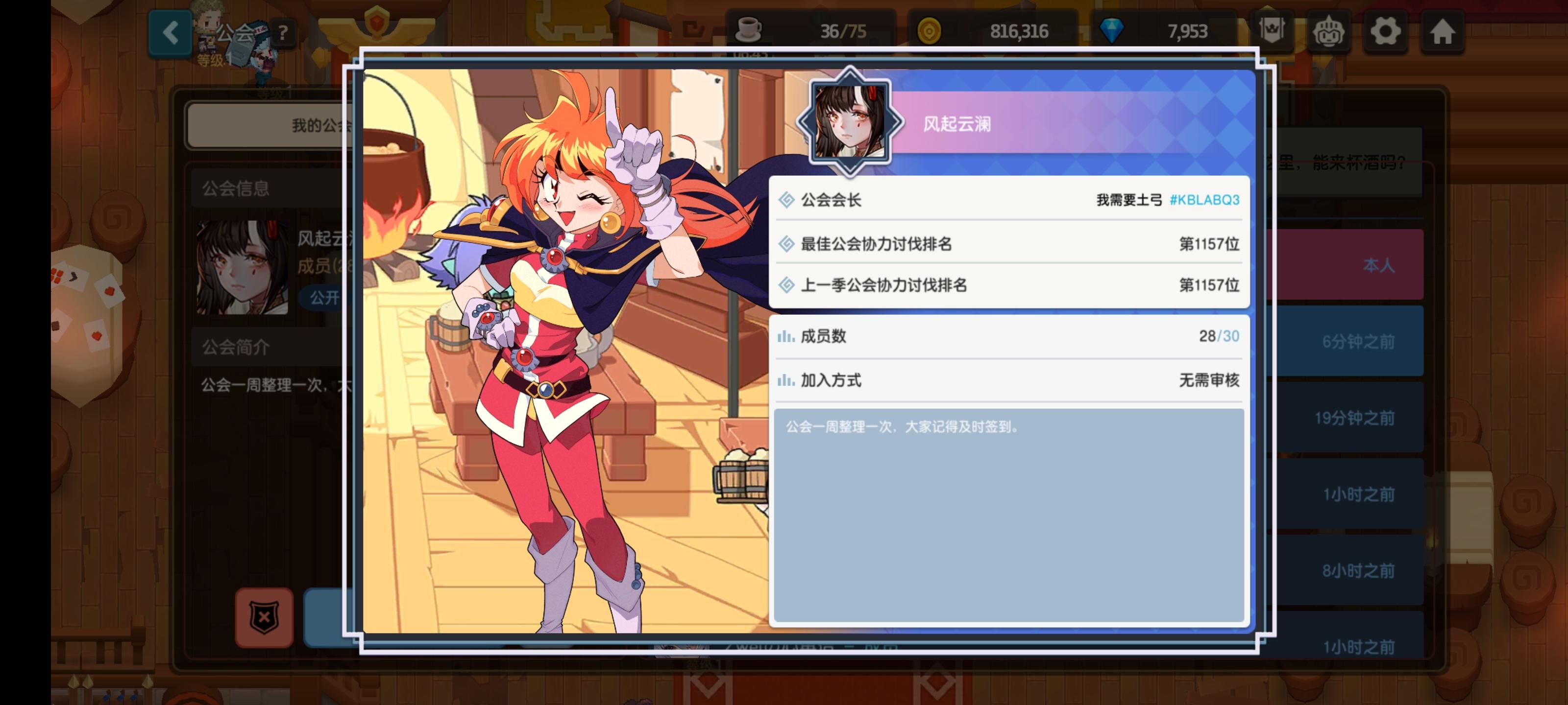 大本营毕方没了,又回来tap了...公会名:起司菓茶的奇妙物语q群:131914559要求:89日均6000以上,不看分刀,总伤有个7.5e这样咱这排名大概是五十多这样,这期有点意外掉了点。佛系公会,不冲排名,不排刀,漏个一两刀也没事,刀出齐就好了。不怎么卡boss,会长有好几个号负责攻坚平时没空可以让会长小代一下,不长代。会长基本全天在线,会战有啥问题随叫随到,挂树、收尾什么的。