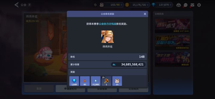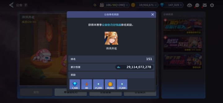 公会名燐燐开花,q群是527622896,本期公会战排名151,这期空余位置有2个,快来吧快来吧 要求的话,上期会战伤害6e以上,或者每天会战伤害平均算下来差不多即可,合适的话就来看看来看看吧
