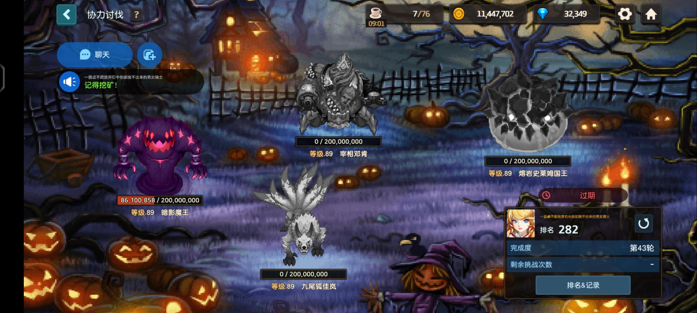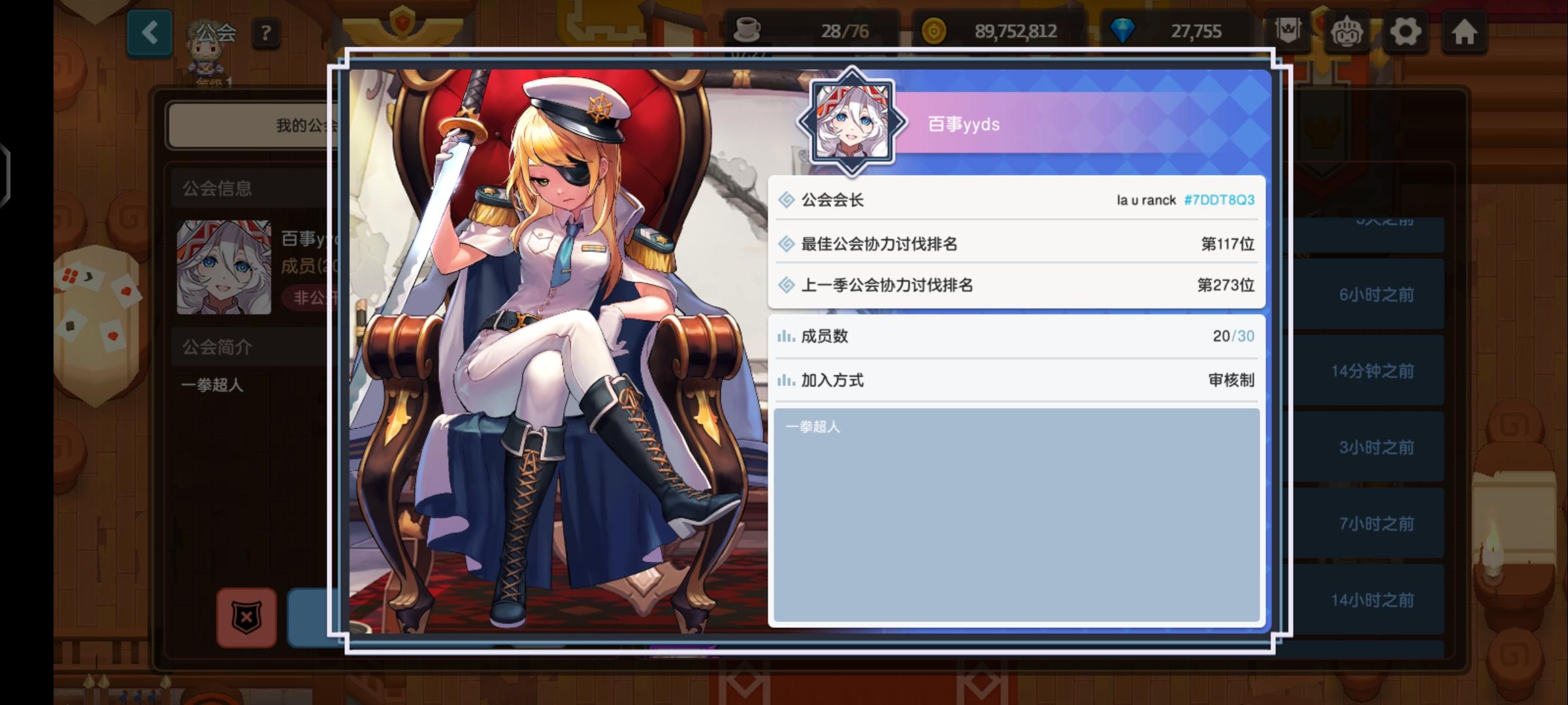 公会名:一圆桌不愿放弃石中剑却拔不出来的男女骑士,赛季排名282(魔女南瓜园赛季),欢迎各位大佬加入。要求:1、本期伤害5亿以上或89级日均伤3.5千万以上2、加微信群,不排刀但每晚会提醒出刀3、尽量配合打难打的boss有意者加微信群