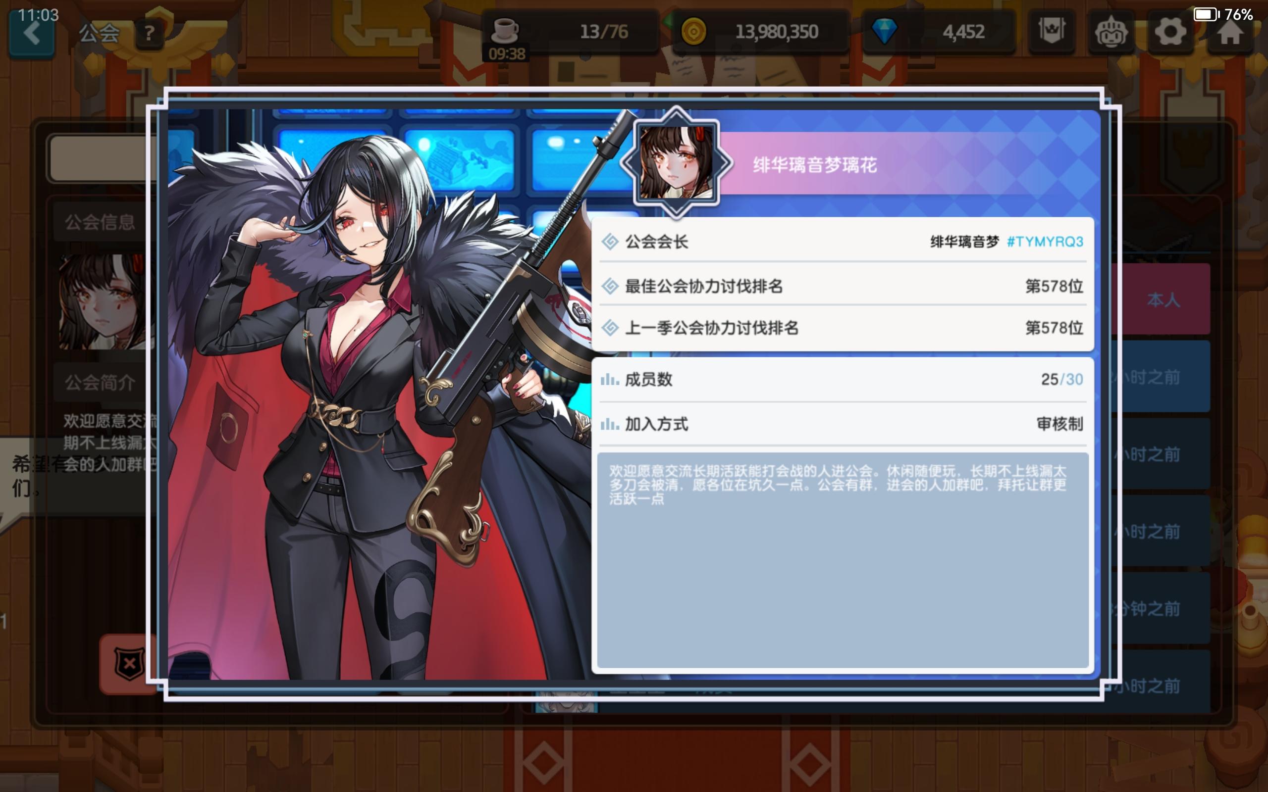 会长是新进前百公会北方少女的会长(咱们会算分会,但是跟北方少女没啥关系),九亿佬开道,伤害要求3e以上,最好全勤,群里有44前百等等各路大佬答疑解惑,欢迎各位加入