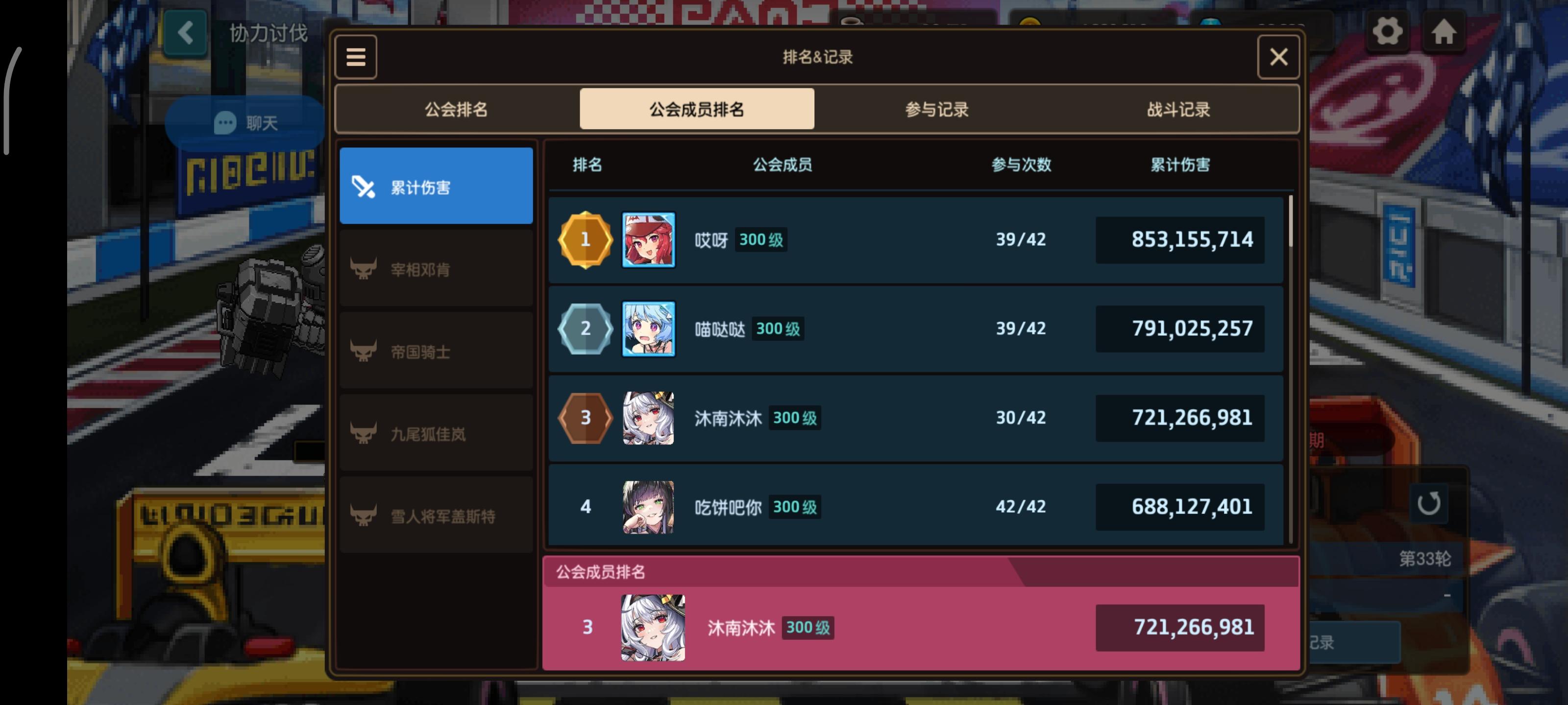 这期会长有三天没法出刀所以这期没要求刀数摆了一期(我本人加工具人小号,果咩,如果两个号满刀的话公会排名还能再高一些)会长啥刀都能出,和小号共同平衡血量,公会也没人毛分,出刀氛围很好休闲公会一切从简,没有群,不催刀,4e+有效刀至少36,以下要求满刀,差一两刀也没关系好好打了就行会战期间三天不在线默认退会,除此之外不踢人长期目标冲冲前五百