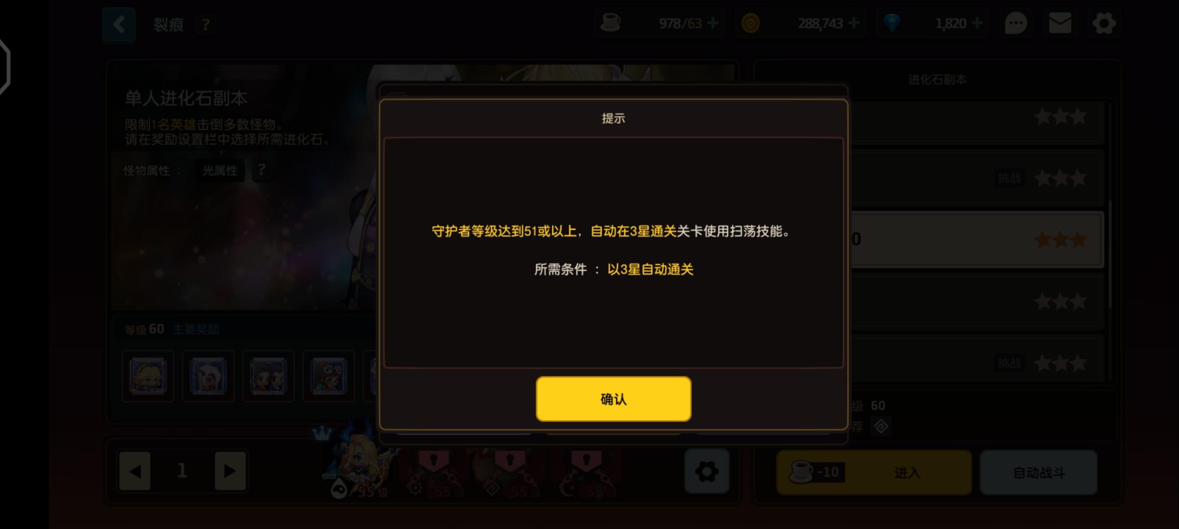 我明明3星自动通关了,而且守护者56级了为什么不能扫荡