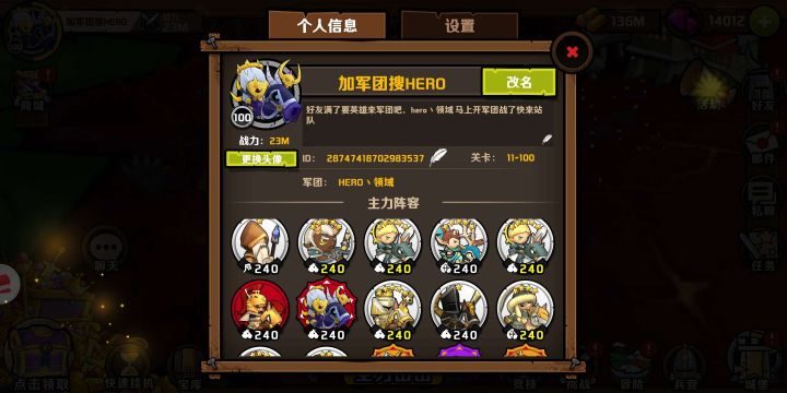 ж【HERO丶领域】ж前言:本军团应发展需要,现向【安卓官服】1-20区战力为【2M】左右常驻活跃玩家发出诚挚邀请,一起共同打造小小军团2榜前公会!军团名称:HERO丶领域军团等级:4级军团排名:11军团坐标:官方8服备战军团掠夺,为后期掠夺资源成长做准备!现长期招收稳定活跃玩家,你可氪、可肝、可佛、可聊天、可交友!弈秋在此欢迎各位1-20区服的兄弟赏脸入驻!!!军团微信群请加军
