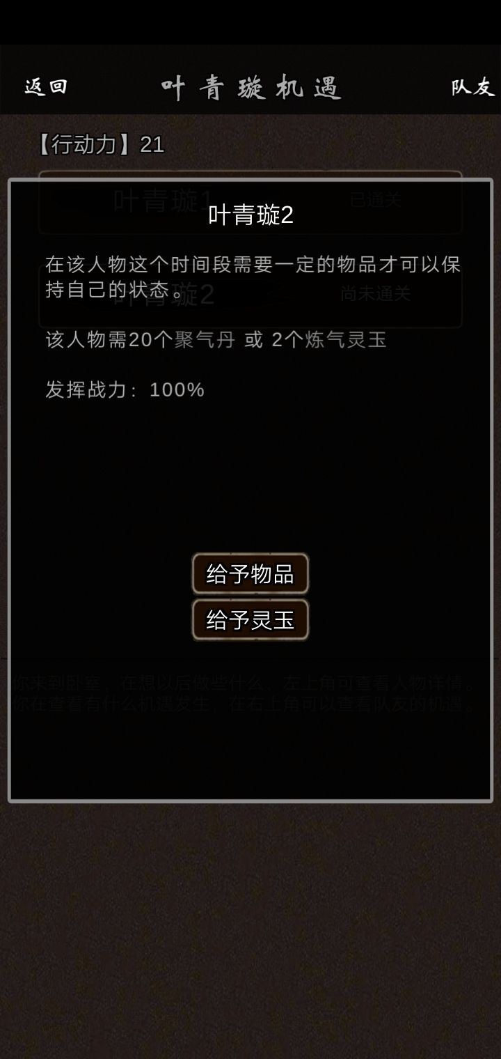 这个攻略是叶青璇剧情二攻略,但是说实话,我觉得叶青璇剧情的难度并不高。至于怎么获得叶青璇,这里充满着对新人的热爱好的,我们废话不多说,开始攻略这里我们可以看到,这里可以提升状态,但是说实话,我不知道提升和不提升有什么区别。总之,升就完了。然后,我们进去副本,首先你左上方的民居里有叶文林叔叔,和他对话获得10个归元丹和聚气丹,这丹药留着,接着我们向左走,左边有一个洞穴,进入之后有个石板1,按