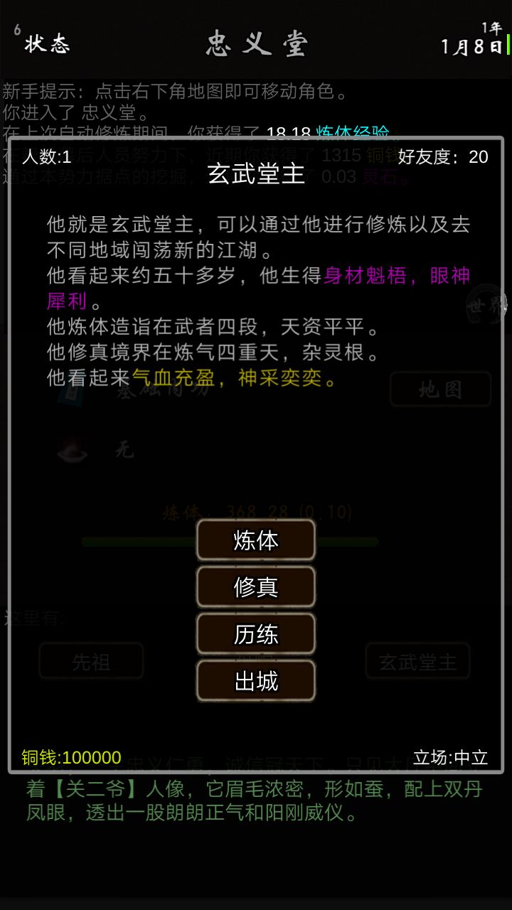 创建人物最好选天生神力,前期练体加生命加攻击显然比加蓝加魔攻的修真要好。退出修炼界面点开堂主进入历练进入英雄救美按照地图路线打败恶霸并邀请小姐姐再按照路线打败大当家ps:打暴击需要白圈缩到与点击出的黄点一样大。用获得的铜钱购买伏虎功和吐纳心法点击左上角,再点击背包–修炼–学习点击人物中的战斗点击切换功法,点击切换即可装备成功这时就会发现自己的修炼效率快了很多再去购买一些练体丹