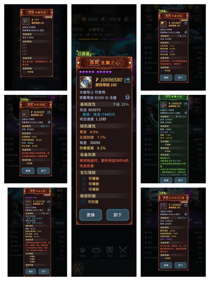 黄金巨人属性图——————————【移影速刷】——————————原理讲解:利用移影移除巨人锁血buff(隐藏buff)放技能/平a来速刷【移影】三渊噩梦/炼狱 时空裂隙掉落速刷核心,移除锁血buff【献祭长袍】二渊人偶道馆 怪物掉落开局多一段持续性伤害,来触发移影buff移除buff后补充伤害【预言/先知三件套】一渊炼狱一 怪物掉落用于触发献祭长袍效果【无型/双子之心】三渊
