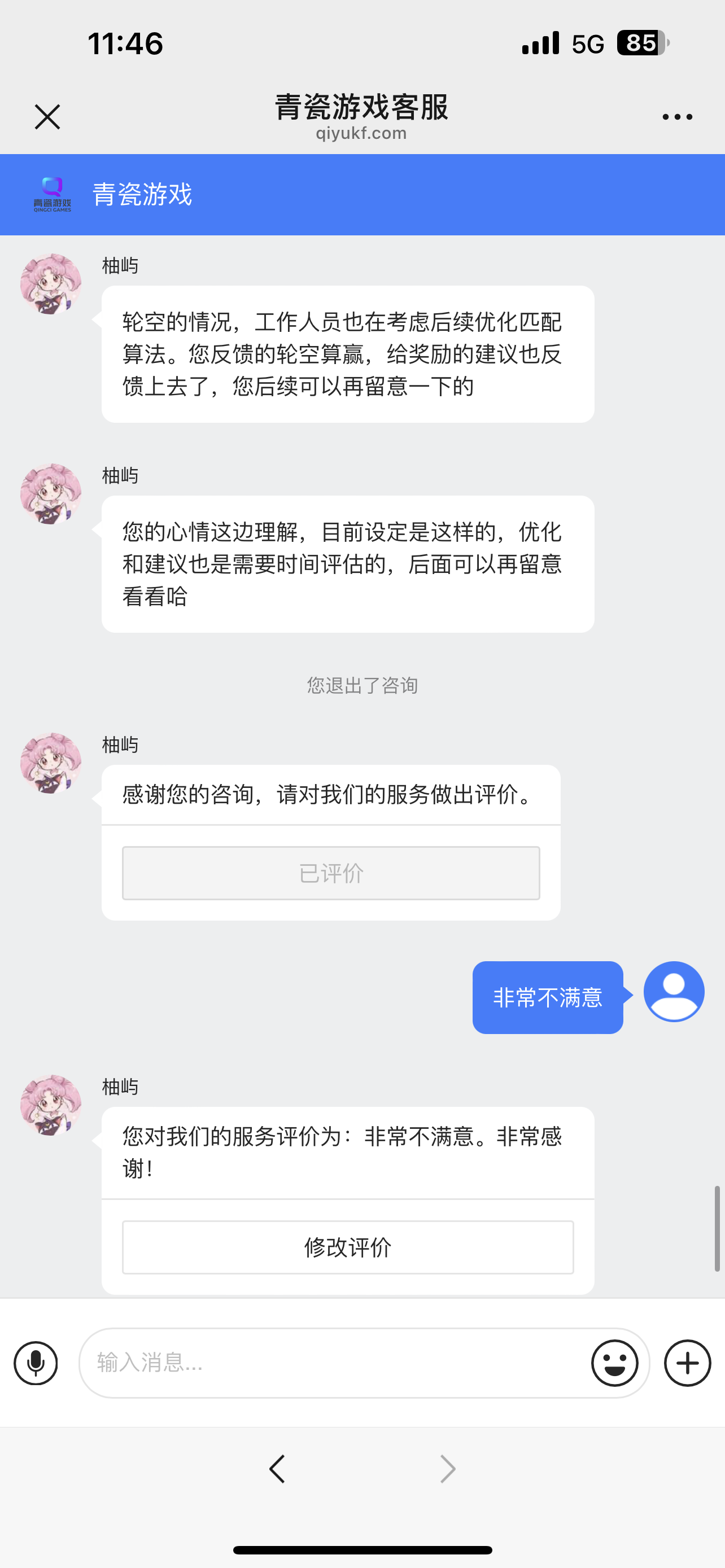 军团活动还有轮空,有轮空就算了,轮空的行会还没有奖励,这合适吗,不应该是轮空判赢吗?一轮空就只能看别人拿奖励,那我们宁愿不需要这个轮空,消费者提出意见,除了找借口搪塞就是编理由,活动今晚上8点就开始了,还让我等后续通知,真是拿消费者不当人啊,你们青瓷太厉害了,有bug就不解决,就当看不到,反馈了也不解决,那你们做这个游戏有什么意义呢?bug漫天飞,天天圈,圈钱还不解决问题,你这样还能吸引什么人?靠