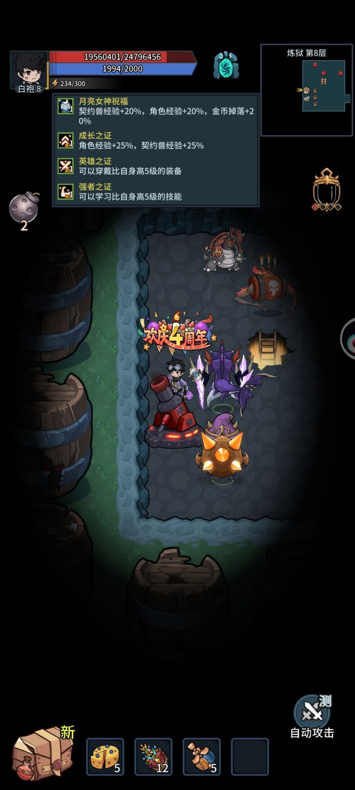 自动模式超级给力,配合上手机设置,直接无模拟器实现后台小窗口自动战斗!,唯一的缺点就是打boss也会自动战斗,然后不会自动吃蓝瓶血瓶,导致大崩出不来然后暴毙。【强烈建议自动吃蓝瓶和血瓶给加上,直接完美。】#发现好游戏