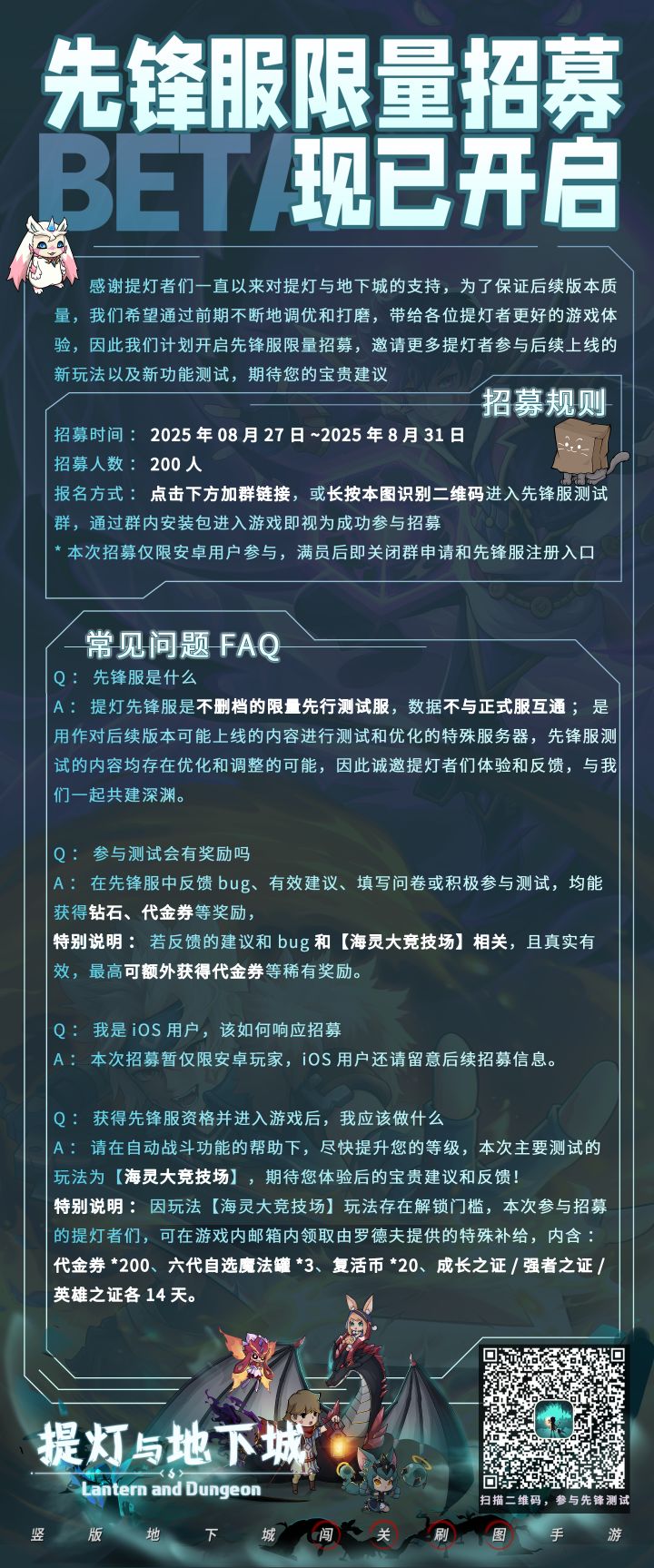 为了让后续新版本内容能得到提灯者们的青睐,五郎诚邀各位提灯者参与不删档先锋服测试!▼参与测试方式▼点击下方加群链接,或扫描招募图二维码,加入测试群,从群文件下载先锋服包体,使用青瓷账号登录并进入游戏,即算成功获取资格注意!!本次测试限量200人,满员后将关闭群申请和先锋服注册>>><<<▼测试开启时间▼2025年8月27日 13:00▼先锋服测试说明▼先锋服是永不删档的限量先行测试