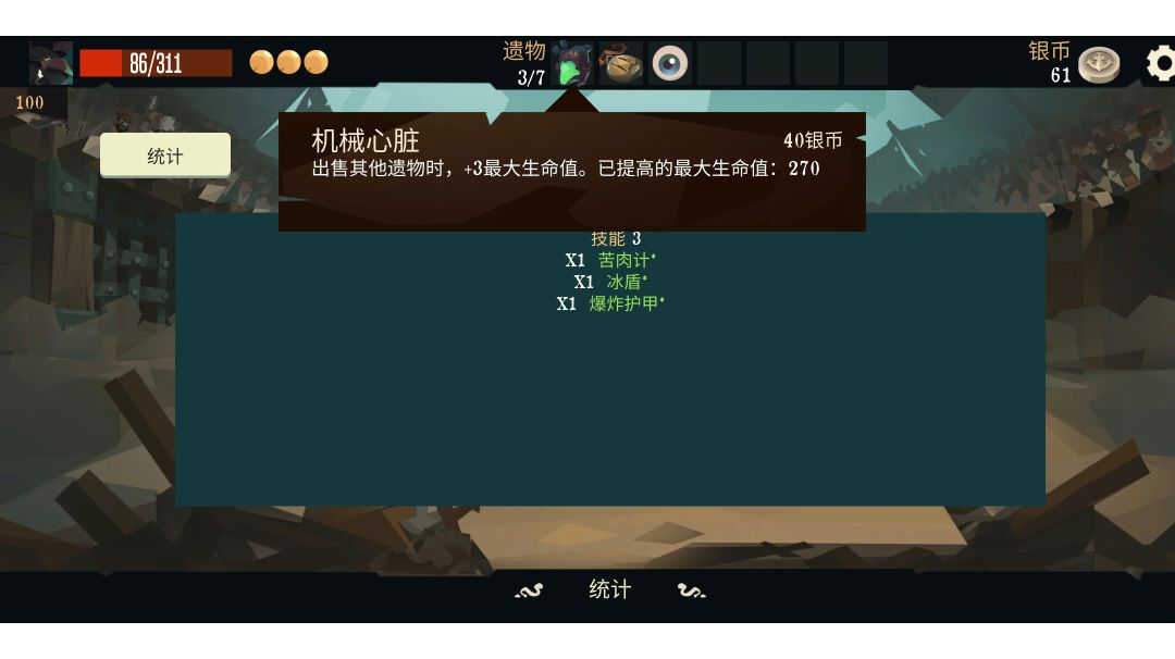 全靠近战暴击,100%暴是真的舒服。 一、遗物 三样遗物如下 *仪式吊坠(消耗1颗弹药使近战暴击) *盗贼匕首(暴击加1颗弹药) *玫瑰(暴击回3点血) 下面的遗物属于锦上添花 *黑暗之书(下局弹药填满每补一颗扣五血)见即拿 *其他加弹药的遗物,见即拿 二、选战利品/卡片选择 *重点:战斗完战利品选择如有加血(+3)必选! *卡片打死别选远程、尽量选近战高攻,次数多 *选卡没有近战怎么办?选遗物点跳过 三、得不到理想的怎么办?要被杀死怎么办?切回桌面默念今天要发财,然后点游戏重打就可以了。 四、效果展示【刀刀暴还加血,策划来了也得挨两刀】