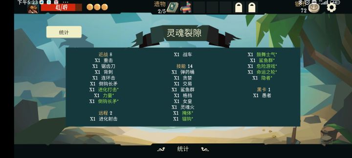 装备核心: 铃铛:单次攻击超过20点摸一张卡。 拳套:回合内每用一张近战卡加一点近战伤害。卡片核心: 双刃大剑:20点攻击力,扣5点血。 声东击西:8点攻击力,对后一个敌人暴击。通关思路: 1.铃铛作为主要拿卡手段,前期没双刃大剑伤害不足,可以靠拳套把声东击西的暴击伤害提到20点。飞刀的伤害也容易达到20点,可以作为摸牌启动器。 2.声东击西可以对抗前排反伤,用后排的高额伤害吸血来