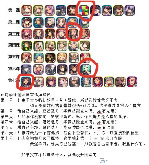 先上群里的推荐图。新手新号开局优先嫦娥(第一天倒数第三个),伊芙(最后一天第一个)有伊芙可以选教皇(倒数第二个)其他看需要选择,第三天推荐火镰刀(上位是提箱,破甲效果还行,新手凑合用完全没问题,这类角色一般用于wb,平时不上场)如果实在缺奶角也可以在第四天第四个(木属性,缓奶),第五天选最后一个荆棘(解毒,缓奶,PVP前期过度能用一用,推图也可以上)或者倒数第三个(瞬奶,奶量一般)。wb马上