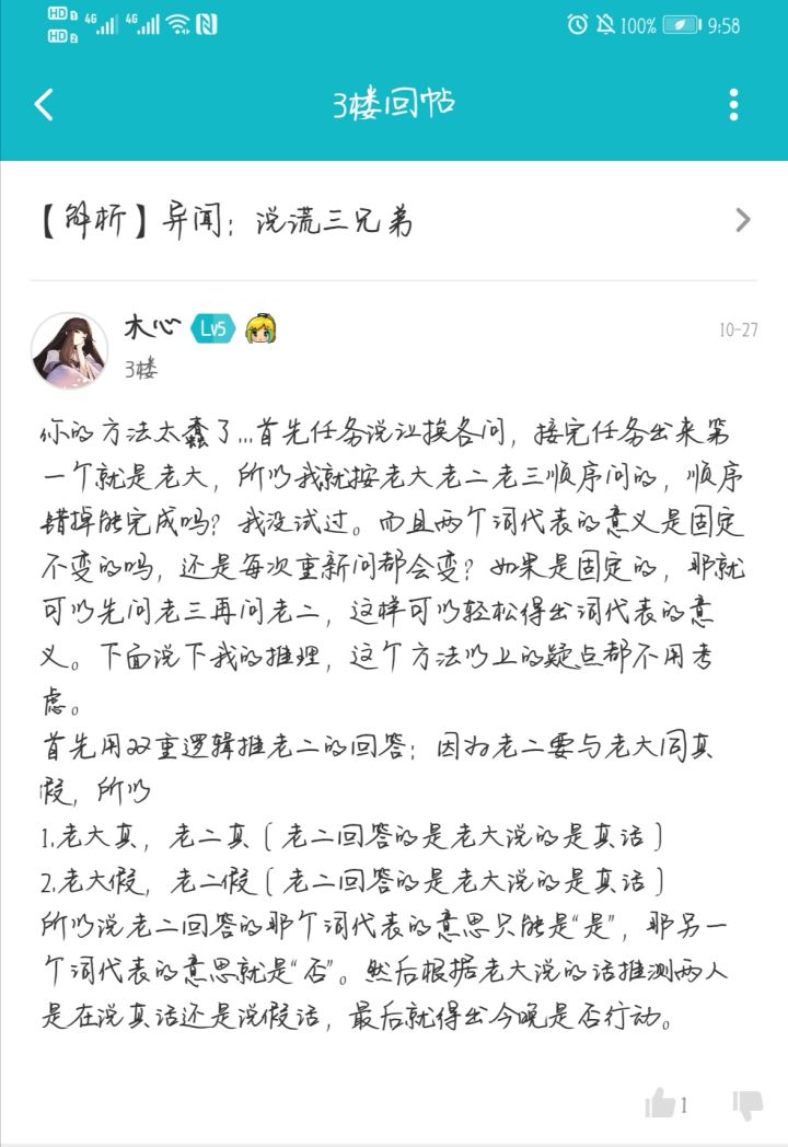 之前发过一个解析,之后又有小可爱提出了一个更简便的方法,截了个图放在下面~感谢@木心!之前还因为自己没理解跟小可爱杠了一下,抱歉抱歉……打脸打脸小可爱的方法是说:如果老大说谎的话,老二也会说谎,那么老二本意就想回答我们否,但因为自己也要说谎,所以就回答了是。如果老大没有说谎,那么老二也不会说谎,所以老二就会回答我们是。综上,不论老大说什么,老二说的词的含义总代表是,那另一个词就是否,之后再看老大