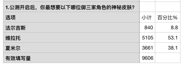 预约破百万的里程碑皮肤投票现已结束啦!截至2019年6月2日24点,一共收到9606个投票,其中维拉托的票数最高,总共获得了5105票,占比53.1%,因此,里程碑中的“神秘皮肤”奖品已确认将是维拉托的皮肤,制作组将在后续公布该神秘皮肤的更多相关消息,并在公测时作为百万预约里程碑奖励送给各位玩家。以下是投票详情:感谢各位白翼的投票和支持!————分割线————520情人节快乐!!在这个