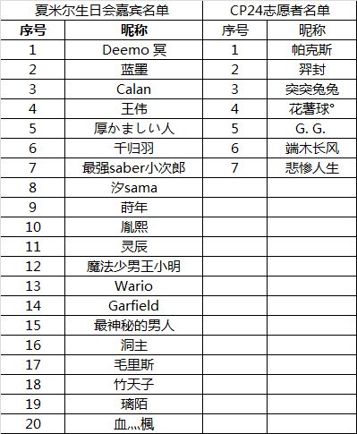 现在是6月3日21:30分,夏米尔来公布生日会的嘉宾名单以及CP24的志愿者名单啦!名单上有你的话酷爱加夏米尔的QQ3447729090联系窝叭,目前有几位白翼的QQ没法儿联系上,请还没联系夏米尔的小伙伴在6月4日18:00前联系窝,不然名额就要给其他白翼噜~————分割线————Hey,各位崔妮塔俱乐部的准会员们:上海地区的大规模阈界侵噬已经在我和维拉托的努力之下被提前击退啦,所以夏米尔
