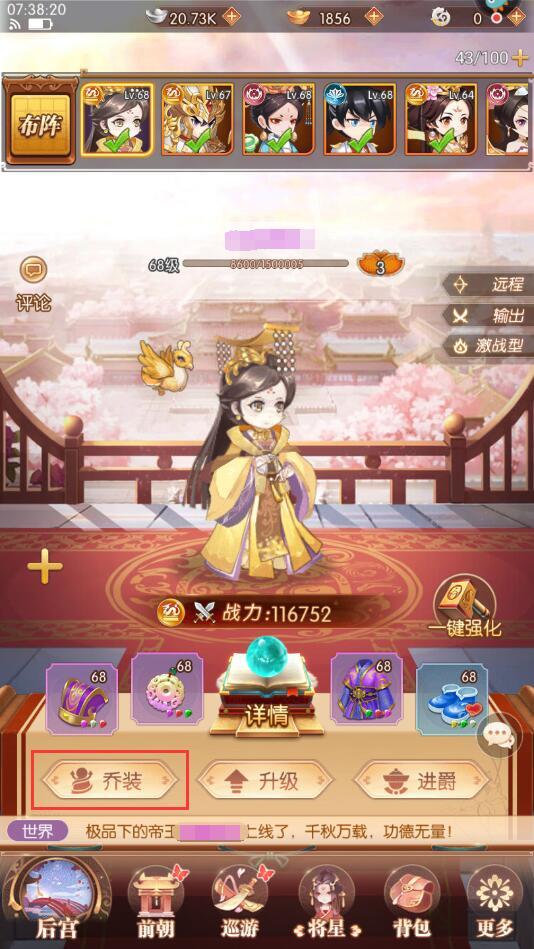 殿下,灵儿发现了既能增长实力,又能在外观上变得独一无二的方法哦!啊,灵儿说得可不是时装,而是【乔装】和【称号】!一、乔装殿下【巡游】大燕总是单一的女帝形象,多么无趣,不如【乔装】打扮一番,装扮成将星们的形象吧!殿下通过【将星】—【乔装】可以开启乔装功能页面。不过灵儿悄悄告诉殿下一个快捷入口哦~在【前朝】界面,殿下【头像框】的下方,有个小按钮,名为【乔装】,点击这个可以直接进入乔装界面呢!