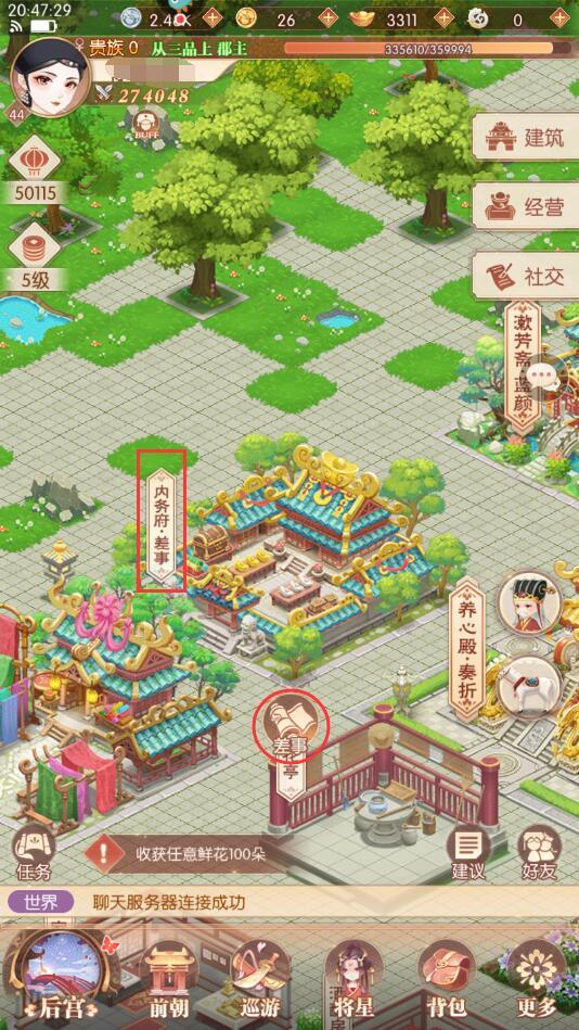 殿下的后宫可真大呀,好多地方灵儿也是第一次去呢,今日殿下不如随灵儿一起去探索后宫有趣之处!一、内务府差事听闻后宫【内务府】是管理皇家事务之处,殿下快随灵儿一道去看看!点击【内务府·差事】,弹出【差事】,点击【差事】。现在出现的就是【内务府差事】页面呢。此页面出现的就是内务府当前列出的、待完成的委托差事。灵儿听闻内务府承办事务多且杂,殿下若是每样都完成定会耗费不少心力,不若挑选合心意的来完