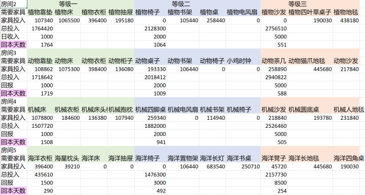 给像我这样坚持走卧龙路线能省就省家徒四壁的玩家提供一个制作家具投资旅馆回报率参考。(不会弄图片,大家将就着看个数字吧)家具材料全用市场出售价格计算(钉子和锭应该之后会变更贵,但是做家具可以完成收藏家也能提升温馨值,这点误差就当抵消了吧)。本帖旅馆开张及升级需求来自慢慢的帖子:https://www.taptap.com/topic/17898838。没有列入房间1,因为本身传统系列做收藏家就是