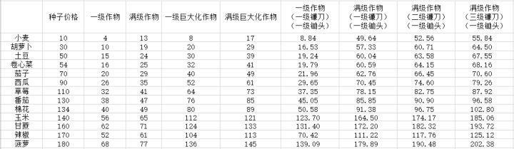 前几天有位老兄提出了农作物收益的问题,不得不说,这么久了我们确实都忽略了这个问题,一直以为这些概率性的东西所带来的收益也就是个锦上添花,可实际上是雪中送碳的主要收益,详情请见但是帖子还并不完整,只计算了茄子的收益,楼主也并不打算全都计算了,我这会一肚子的气,就想找点不用动脑子的事情做,就想起了这个帖子,随手算一算到底各种作物的收益是多少。接下来是公式的表达:((小型作物价格+(巨大化作物价格