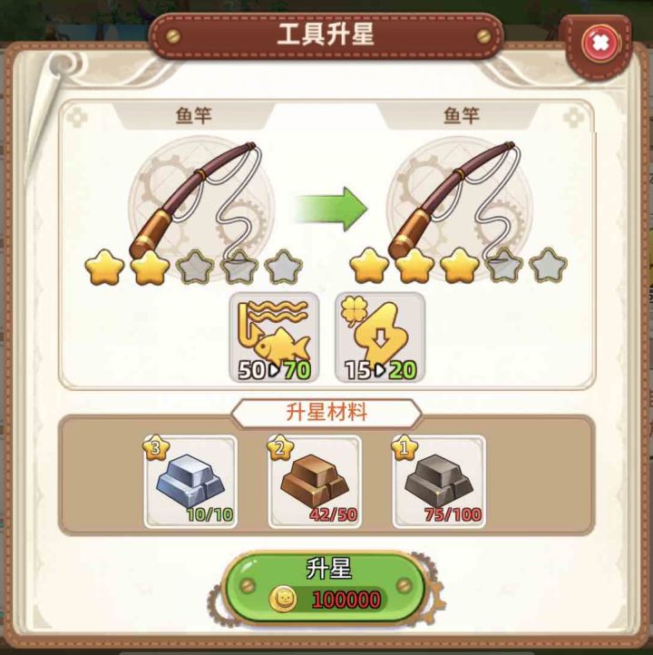 不算不知道,一算吓一跳,努力将渔具升级到5星的进程中。发现太缺金币了。。。。全部依靠从集市上采购的话,一个工具从0到5星,需要1098万多的金币。。。。
