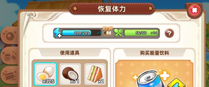 悠长假期~日常补充食物必备会员党必备食物:鸡蛋,只需市场24元购买,快速加工,即可获7体力14饱食度。非会员食物:椰子,只需¥45,不需加工,即可获得6体力12饱食度,日常必备。睡前加到40多,再加一块巧克力,做个甜甜的梦。