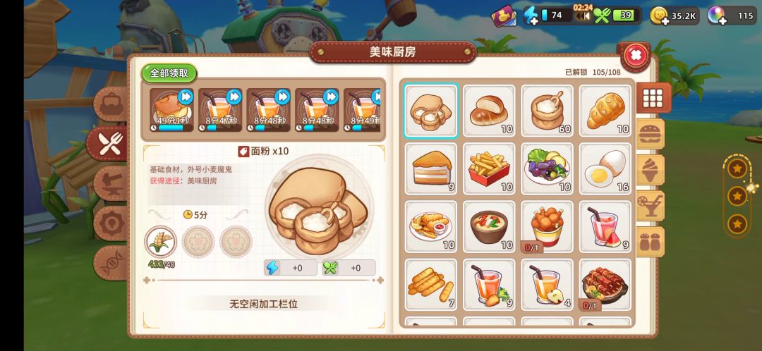 既然厨师套装可以一次十个小麦一格,那赶紧的把所有都安排上嗷,糖十连糖十连糖十连!!!我不想一次三分钟只能搓7个了,一次搓70就显得比较人性化啊,如果只是能搓面粉的话,还不如安卓连点器好用啊。。
