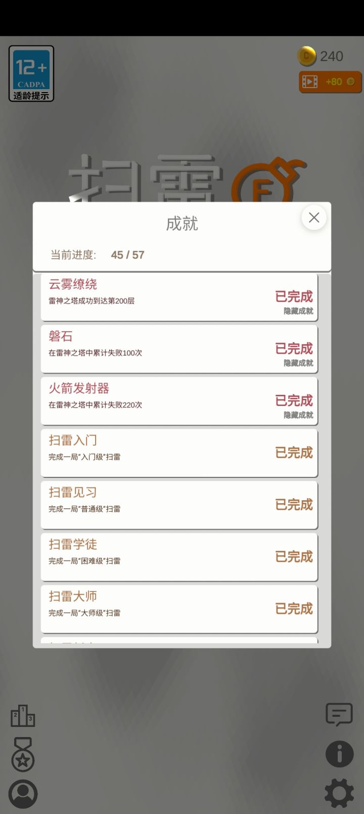 常见问题1.死猜死猜是标准扫雷必备的。标准规则下,无法避免。具体可看关于超凡是否猜测过多,有著名超级无敌厉害的大神米花糖!进行测试,结果为在允许使用游戏提供的三次复活机会,通关率可接近百分百。2.白屏解决办法,关网进本地模式,再联网登录。或者卸载重装。注意:如果原来是本地模式有数据而登录模式没数据不要试第二种方法,会导致数据全无。3.找不到确认键如修改手机字号,你手机字号太大了