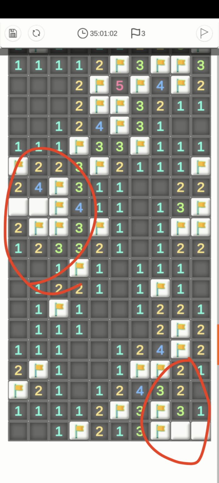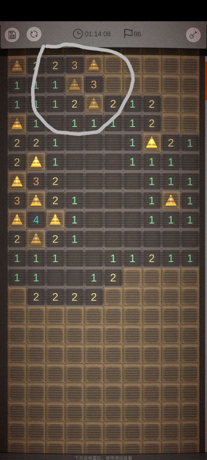 (上面显示3个雷,检查后就剩下这2处了,图中红圈的2处,大家帮忙看看,其实两处都是两种方式的吧,但是右下角的雷铲的时候炸了