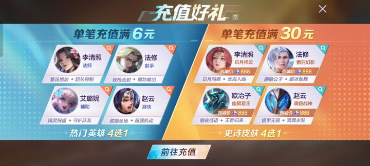 1️⃣1元惠购礼包含:①英雄任选礼包(游戏商城中仅可使用金币购买的英雄)②萌爪福喵头像框③500钻石┄┅┄┅┄┅┄┅┄┅┄┅┄┅┄2️⃣首充满6元包含:①热门英雄4选1:法师-李清照(1499金币/或588龙晶)射手-法修(1499金币/或588龙晶)辅助-艾璐妮(1499金币/或488龙晶)游侠-赵云(1499金币/或588龙晶)┄┅┄┅┄┅┄┅┄┅┄┅┄┅┄3️⃣首