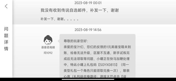 2023年8.28号补发了。1.说好给传说自选,邮件没有,背包也没有2.反馈传说自选没有的问题,派机器人给我答复,没有真人处理,一直敷衍,还给几个没用的兑换码,打发花子。2023.8.19号就反馈了,至今也没给我补发3.加里面的群也不同意,没有审核通过的,默认不让进群4.承诺未做到,做不到就不要乱承诺,撒谎诈骗。5.看图五,2023.8.24号刚注册了个小号就有,曙光确实会玩,诈骗+区