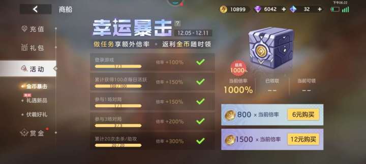 金币暴击活动1.什么是金币暴击活动?付费购买基础数量的金币,做任务可获得额外倍率,最终获得的金币数=基础购买金币数x倍率2.基础档位有6元(800金币)/12元(1500金币),做完任务最高获得10倍倍率,即最高可获得(800+1500)x10=23000金币Tips:总金币数量=充值金币数X倍率不要以为原有的金币数会额外再给一次哦~2.如何进入金币暴击活动呢?方式一:【商船】【活动】【