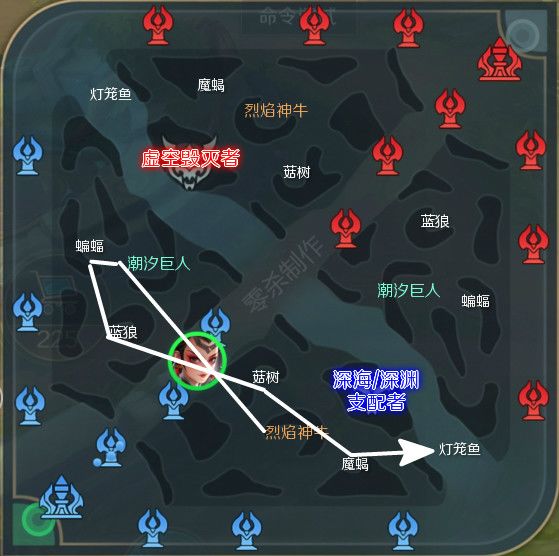 野怪名称和分布:注:上图中不同类型的野怪,名称颜色不同,白色名称均为小野。野怪分类:小野:菇树、魔蝎、蓝狼、蝙蝠、灯笼鱼(无特殊功能,击杀后提供金钱和经验)BUFF怪:潮汐巨人、烈焰神牛(击杀后提供红/蓝BUFF)大小龙:虚空毁灭者、深海支配者、深渊支配者(击杀后提供全队增益)首次刷新时间:小野:蓝狼、蝙蝠、菇树、魔蝎、灯笼鱼,开局30秒刷新。BUFF怪:潮汐巨人、烈焰神牛,开局3