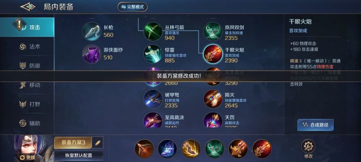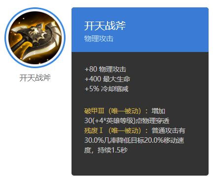 T0:开天战斧、众生寂灭、皇权宝刀T1:至高裁决、天罚、陨灭、千眼火炮、岚风双剑、闪电之刃、掠食者之剑、幽冥斩魄T2:狂沙战枪、破甲弩、影灵之附T0:开天战斧前期合成路径平滑,小件“寒锋匕首”是有极高性价比的前期装备。此装备可提供34-90点物理穿透,配合物理穿透符文在后期可达到120物理穿透,现版本输出英雄的物理防御在15级时大概在180-200点之间,效果完胜破甲弩(现版本坦克过于弱势
