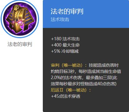 T0:法老的审判、冰霜哀歌、亚图姆的传承、深渊泉眼T1:迷雾铃、芭蕉扇、巫王法典、碎空杖、魔灵法帽、雷霆法杖T2:慕拉法杖、潘神的灵弓、归元鼎T0:法老的审判、冰霜哀歌、亚图姆的传承这三件装备之所以在T0,要从“法老的审判”说起,法老的审判这件装备自身提供了可观的法术穿透和3秒的最大生命值“法术持续伤害”。但这个持续3秒、每秒一次的微量伤害,它是法术伤害(像句废话,但并不是)。而法术伤害可