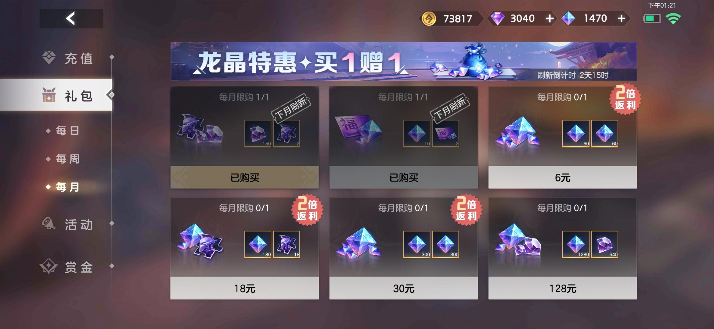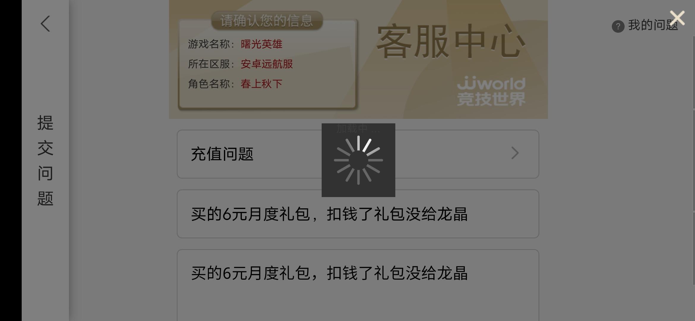 买的6元月度礼包,扣钱了礼包没给龙晶!在游戏内联系客服也不管用,一直处于提交失败状态!!!
