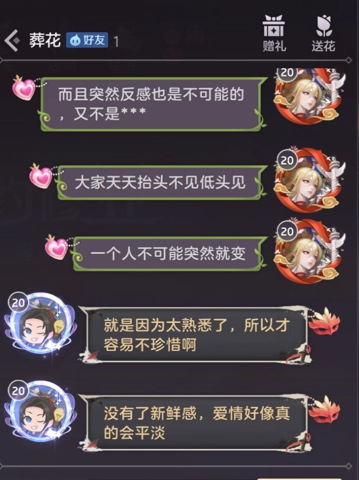 一大早上的居然有人在游戏里跟我唠爱情观哈哈😄游戏真是个神奇的世界不过这人名字居然是我以前用过的游戏圈名难得看到有男生用这个🕊️寒塘渡鹤影,🌙冷月葬花魂🌹