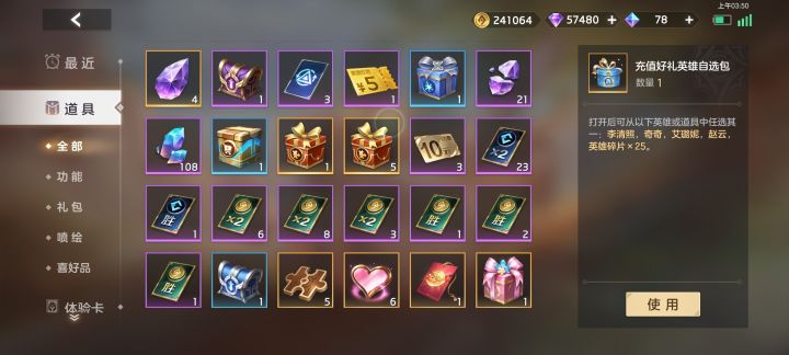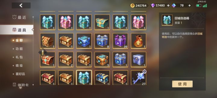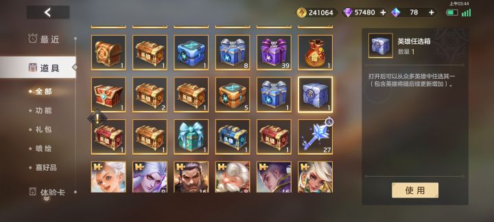 貌似我留在背包里面的东西有点多…无聊数了一下,还有十九个英雄自选礼包,八个头像框自选礼包。回城特效这类的拥有也一直留着没有用,没有解锁…还有之前活动留下的各种道具(可惜一些在一次大更新官方自动以一个金币换一个道具给拿换了…)