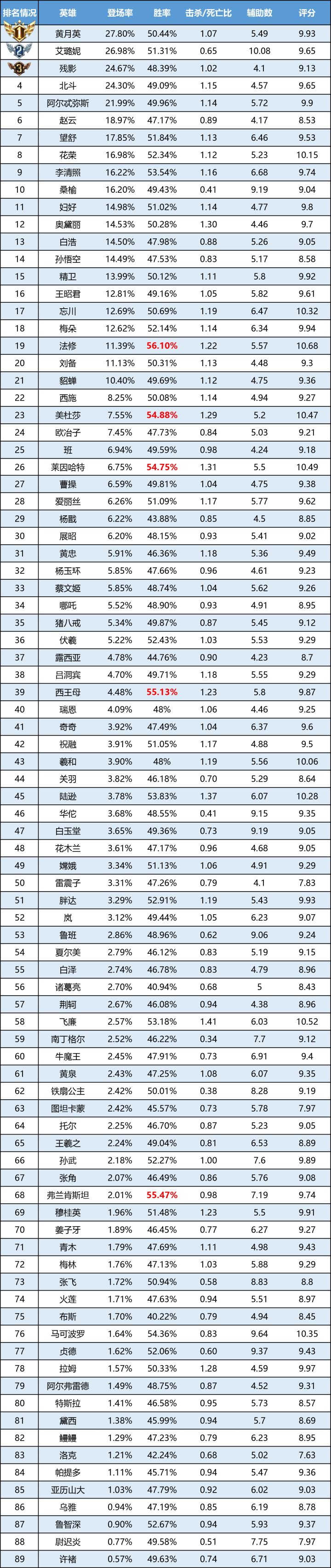 裂谷一声巨响,小桃子闪亮登场!欢迎观看《曙光英雄》英雄周榜!简报:北斗热度全榜第一!高分段胜率有所上升。华荣重做后登场率直线上升,上手难度降低受更多守护者的欢迎~禁用环节中,孙悟空“BAN”率第一,与白泽、诸葛亮共同在“BAN”位“买房”,成为非禁必选的存在,详细数据请往下看哦。数据统计时间为:4月24日-4月30日模式:全模式(除人机)排序:榜单按出场率由高到低排序一、殿堂骑士以下