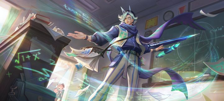 “你们音乐老师今天有事,这节课改上数学” - 瑞恩·第五象限角色故事:瑞恩是曙光学院的一名平凡的数学老师,他在各种意义上都非常平凡,所以你可以在他身上看到你对数学老师的一切印象…皮肤海报:皮肤设计展示:皮肤设计思路:形象灵感:瑞恩作为曙光学院中普通的数学老师,在整体形象的设计思路上,主要是围绕着对数学老师这一角色的日常上课状态以及使用的教具方面进行发散设计,以达到贴合主题的目的。美