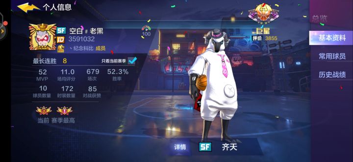 提前声明 依旧是零充 依旧是手搓这赛季个人偷懒 赛季伊始没冲排位 导致后期卡在名人堂七将近200把 死活上不去 也是醉了在这个pf是爸爸的版本 作为下水道职业 被帽出了新高度 一度整场只传球不得分 怕了 真的怕 不是技术可以弥补的短板 pf的盖帽范围和C的补防速度在这个版本有了质的飞跃 加之前段时间 削弱了中投命中 作为八技中投sf在这个赛季已经彻底没有脸面了 各种空位打铁 各种错身不进让我一
