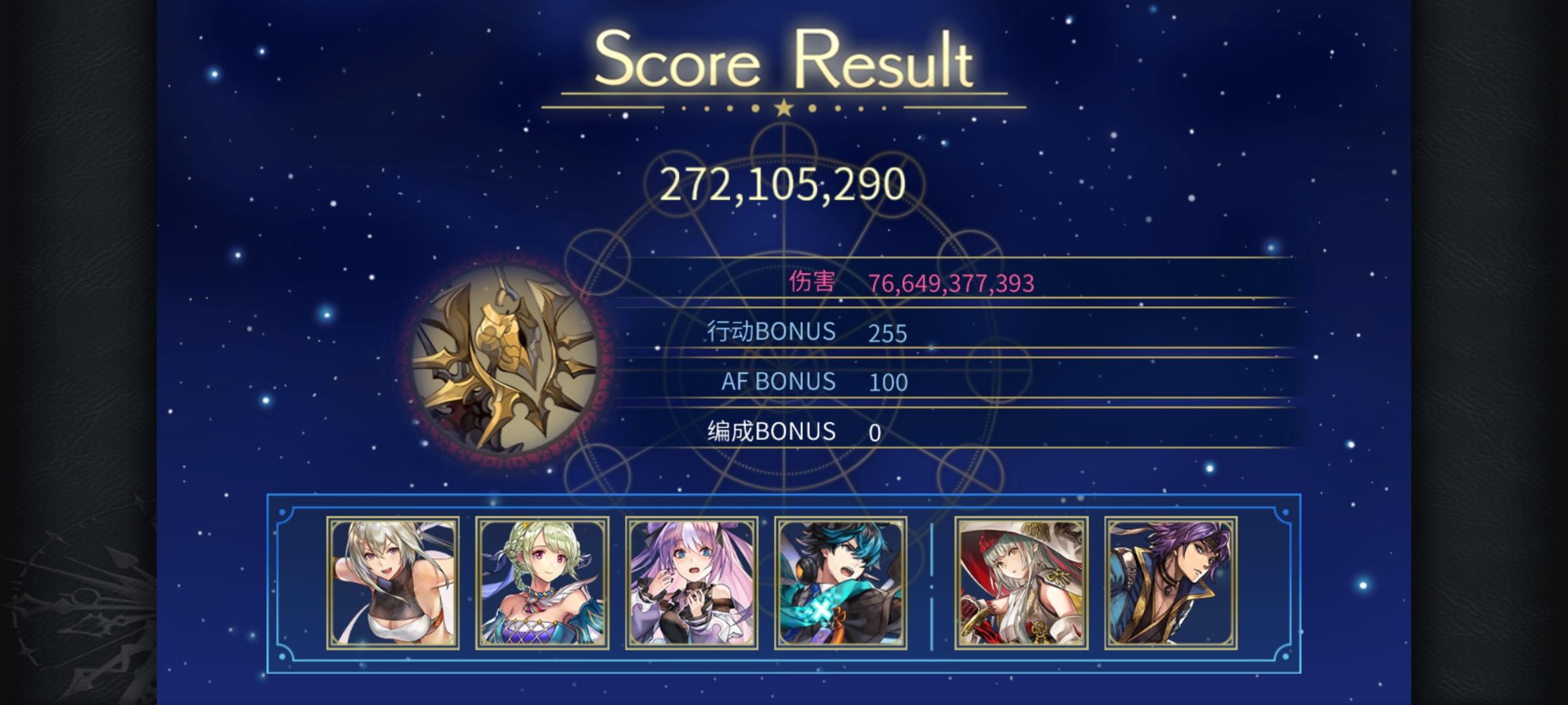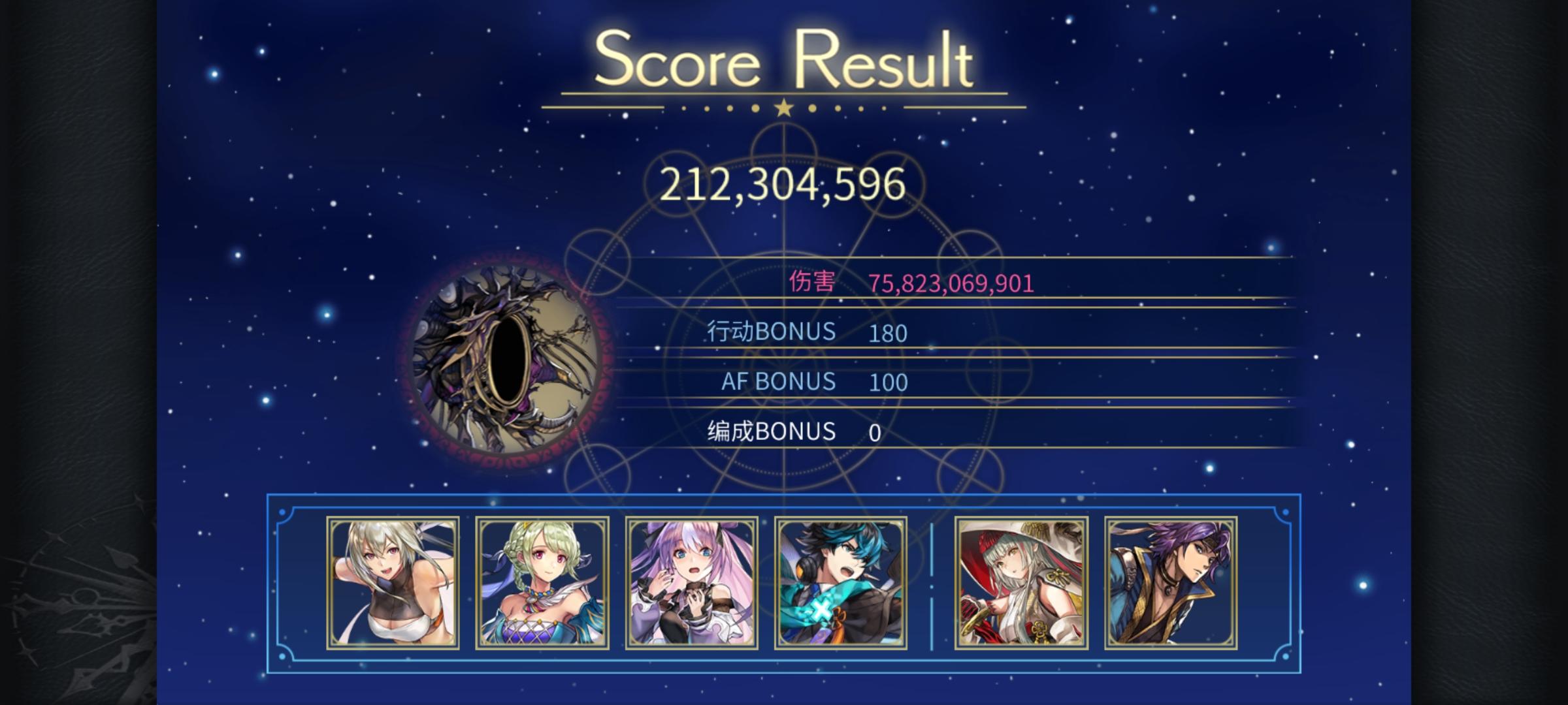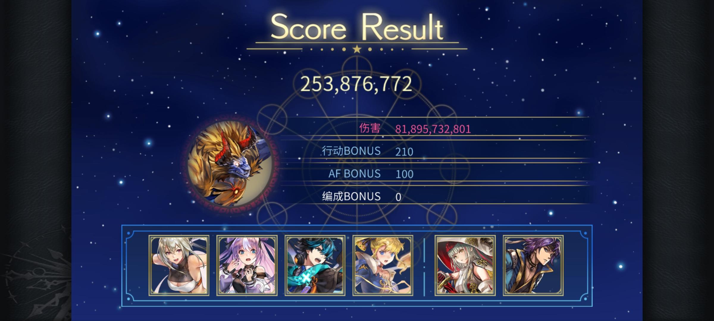 打两次af两次星爆(可见上一个视频),前卫至少有一个个性符合应该还有一些可以通用(比如巴雷斯,合成鬼龙),给其他队伍留个纪录吧-------------------------------------------更新:龙神的使者(有一定的配置需求和手法需求,可能需要魔力较高的谜晶武器,我带了智力勋章)、时层扭曲巨魔奇诺和天照之书可能不用ac明芳的雷队凑全个性会好一点